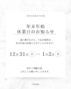 2025.12.20 平素よりご愛顧いただきありがとうございます。 年末年始休業は下記の通りです。 12月31日(水)〜1月2日(金) ※1月3日は成人式の着付やレンタルのため、Marnailは休業日としております。 Marnailは1月4日からの営業となります。 どうぞよろしくお願い致します。
